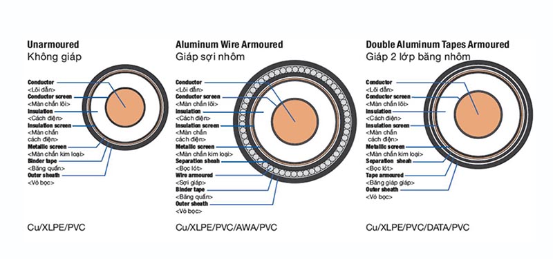 UnAr = Không giáp; AWA = Giáp sợi nhôm; DATA = Hai giáp băng nhôm