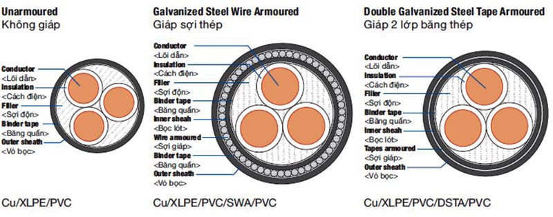 Cáp hạ thế 3 lõi cách điện XLPE 0.6/1(1.2)kV